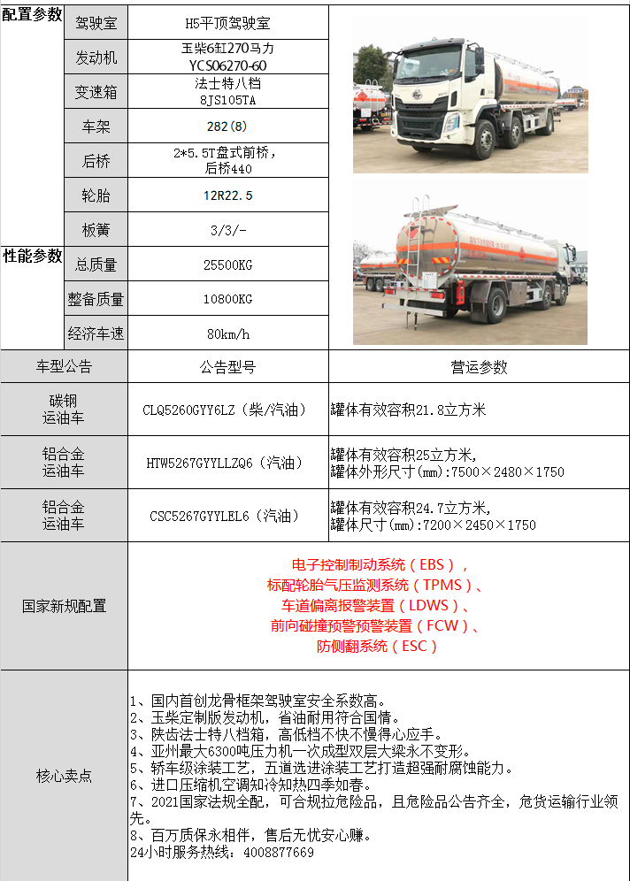 8JS105TA,Ф430離合,2*5.5T盤式前橋,后橋440/4.444/加寬制動器,板簧3/3/-,282(8)車架,400L鋁合金油箱,國產方向機,12R22.5,前機械后氣囊駕駛室懸置、電動液壓翻轉、夾層玻璃、電動玻璃升降器、機械減震司機座椅、電磁離合風扇、LCD液晶儀表、MP3+收音機、自動空調、定速巡航系統、國產閥、車載終端(行駛記錄儀+兼容北斗GPS)、外部遮陽罩、鋁合金貯氣筒、中控鎖、自動調整臂、多態開關、真皮多功能方向盤、右轉提示音響、前置排氣管、前輪防爆胎裝置、盤式前橋、排氣火花熄滅器、危險品運輸頂燈、ECU限速裝置(限速80km/h)、駕駛室電源總開關、導靜電橡膠拖地帶、T-BOX、EBS、TPMS、LDWS、FCW
