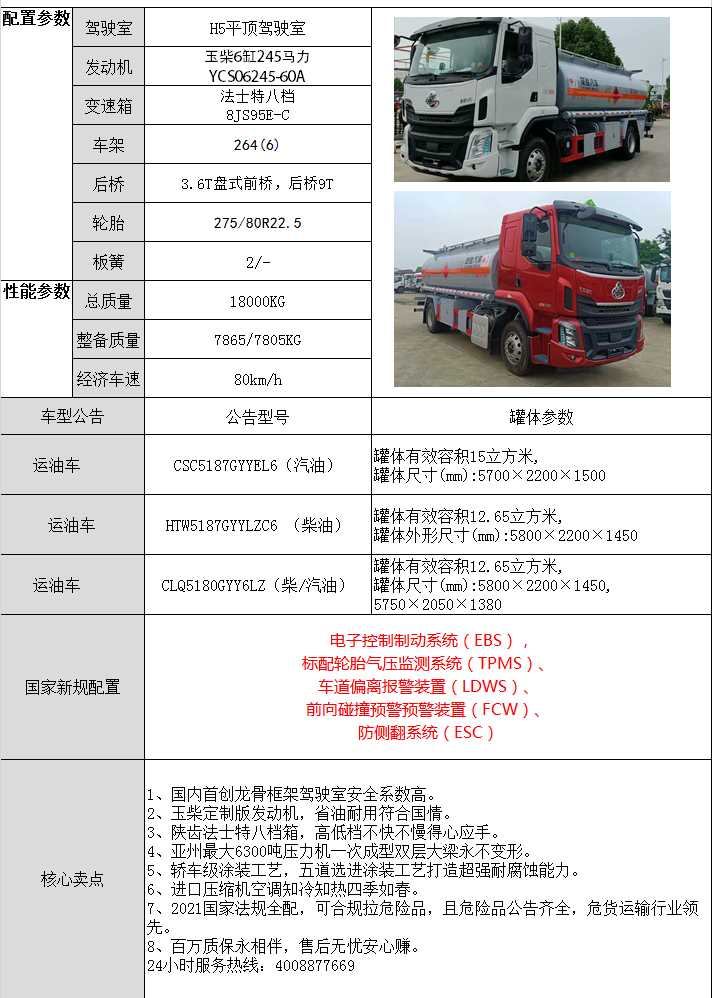 發動機YCS06245-60A,8JS95E-C,Ф430離合,3.6T盤式前橋,后橋9T/4.1,板簧2/-,264(6)車架,350L鋁合金油箱,國產方向機,275/80R22.5,機械全浮式駕駛室懸置、液壓機械翻轉、夾層玻璃、電動玻璃升降器、機械減震司機座椅、電磁離合風扇、LCD液晶儀表、MP3+收音機、自動空調、定速巡航系統、國產閥、車載終端(行駛記錄儀+兼容北斗GPS)、外部遮陽罩、鋁合金儲氣筒、中控鎖、自動調整臂、多態開關、真皮多功能方向盤、右轉提示音響、前置排氣管、前輪防爆胎裝置、盤式前橋、排氣火花熄滅器、危險品運輸頂燈、ECU限速裝置(限速80km/h)、駕駛室電源總開關、導靜電橡膠拖地帶、T-BOX、EBS、TPMS、LDWS、FCW