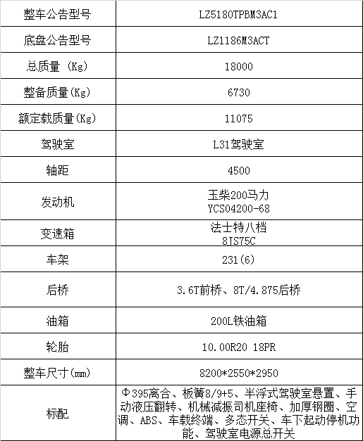 半浮式駕駛室懸置,發(fā)動機YCS04200-68,3.6T前橋、8T/4.875后橋,8JS75C,板簧8/9+5,231(6)局部加強車架,200L油箱,10.00R20,手動液壓翻轉、夾層玻璃、電動玻璃升降器、機械減震司機座椅、空調(diào)、ABS、車載終端,ABS、免維護電池、車下起動停機功能、駕駛室電源總開關、PTO開關