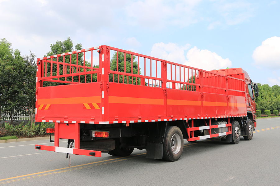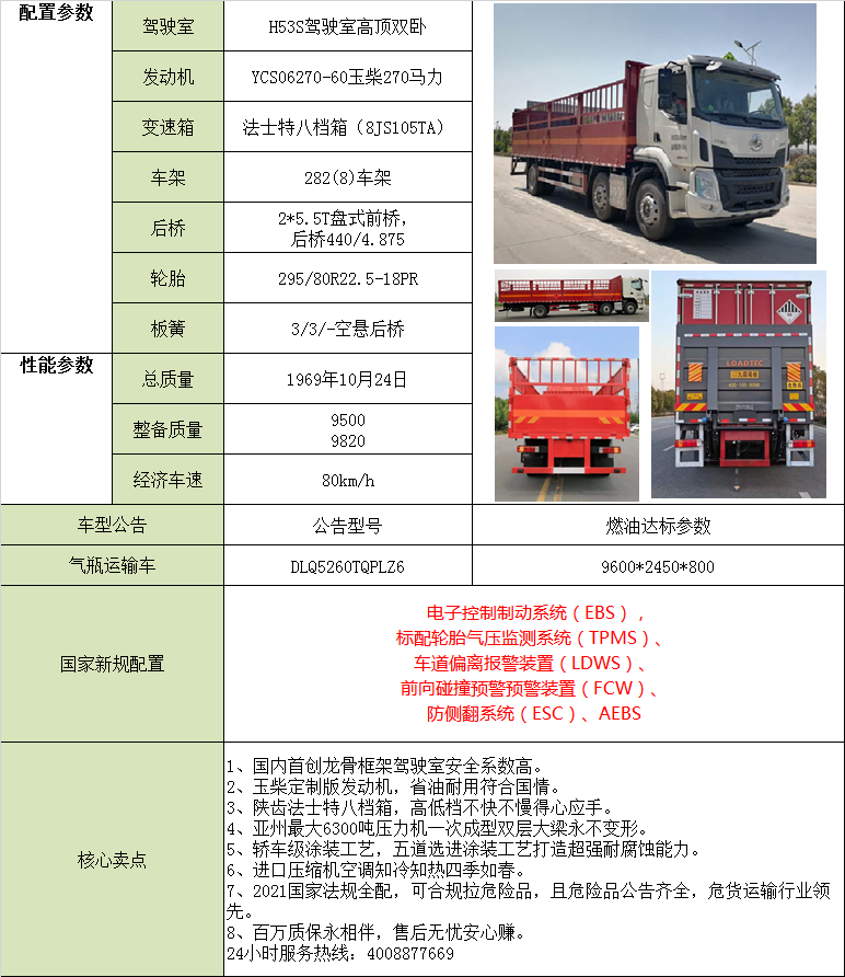8JS105TA,282(8)車架,2*5.5T盤式前橋,440/4.444/加寬制動(dòng)器/油潤滑空懸后橋,12R22.5輪胎,板簧3/3/-,400L鋁合金油箱,前機(jī)械后氣囊駕駛室懸置、電動(dòng)液壓翻轉(zhuǎn)、機(jī)械減震司機(jī)座椅、自動(dòng)空調(diào)、定速巡航系統(tǒng)、ABS、車載終端,中控鎖、真皮多功能方向盤、前置排氣管、前輪防爆胎裝置、盤式前橋、排氣火花熄滅器、危險(xiǎn)品運(yùn)輸頂燈、ECU限速裝置(限速80km/h)、駕駛室電源總開關(guān)、導(dǎo)靜電橡膠拖地帶、T-BOX、EBS、TPMS、LDWS、FCW