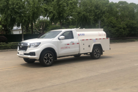 總質量:3345KG,額定載:1100KG,整備質量:2115KG;罐體容積 1.2m3,罐體采用優質碳鋼(3mm)焊接制作,封頭自動焊,拼板自動焊,罐內裝有防浪板,配備 40/50 灑水泵,配后灑陀。65三通球閥、65兩通球閥、三通濾網、消防水口、吸水口各 1 個。罐體左右兩側優質碳鋼板裙邊,罐體尾部仿罐體外形工具箱一個,工具箱底部花紋鋁板