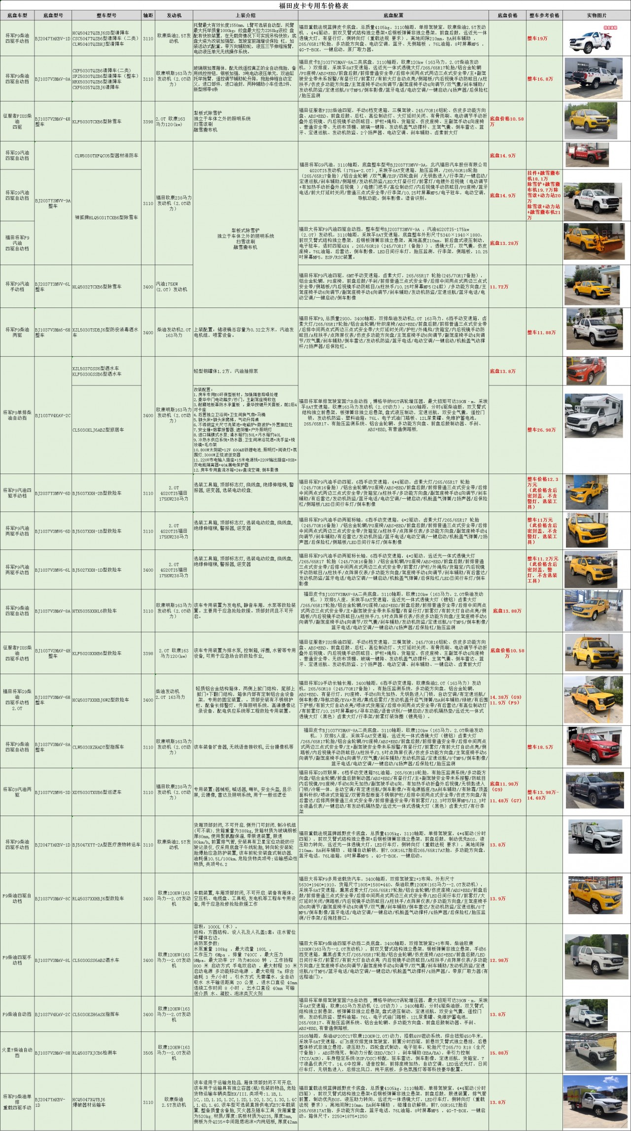 湖北加貝汽車銷售服務有限公司,產品品種多,材質過硬、重工工藝、軍工管理、質量、售后服務可以保證,福田2024年皮卡專用車價格表購買您應該放心!