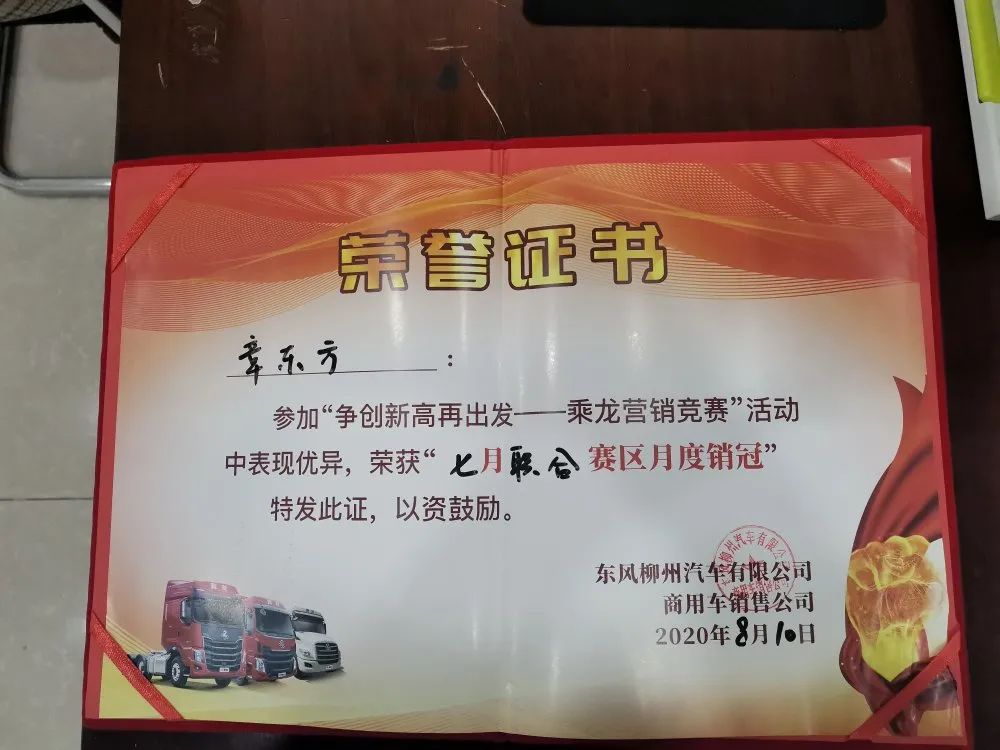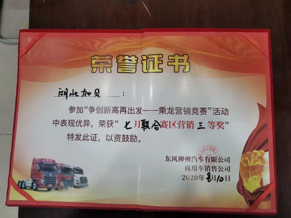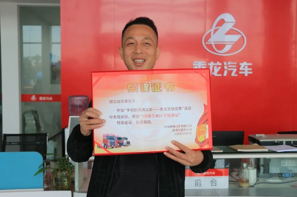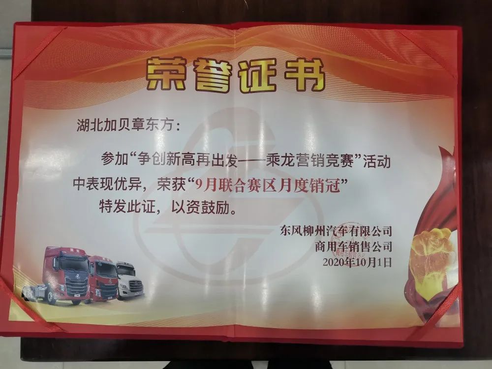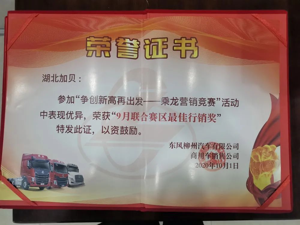 恭喜柳汽乘龍湖北加貝店和店內(nèi)的銷售團隊經(jīng)過幾個月的不懈努力喜提柳汽榮譽證書!